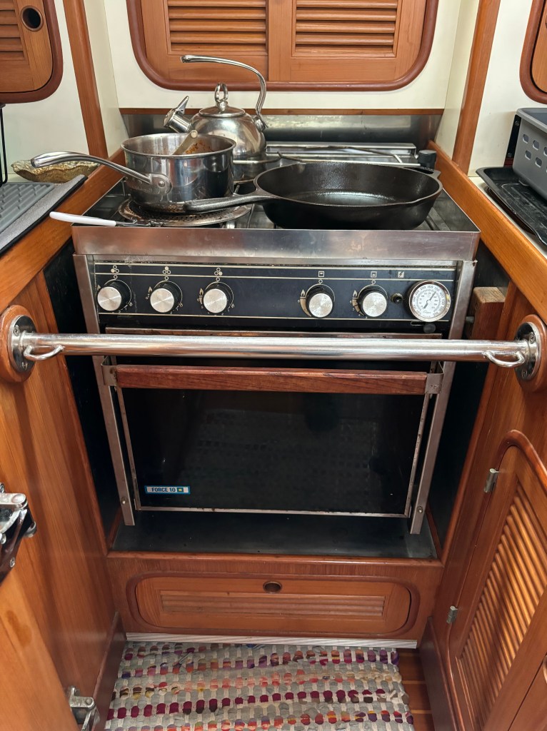 Andante’s original-equipment propane-fired oven is low-tech (no thermostat) and poorly insulated. But it gets the job done under some crazy conditions and still cooks better than our fancy oven in the dirt house. Go figure.