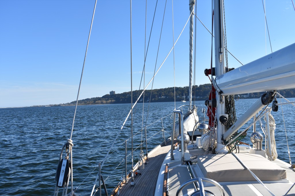 The day started at the far western extreme of Long Island Sound at the Throgs Neck Bridge. That’s SUNY Maritime under the right tower. Winds were calm for the first time in days. They perked up again later allowing us to beneficially motorsail for a while in NY harbor.