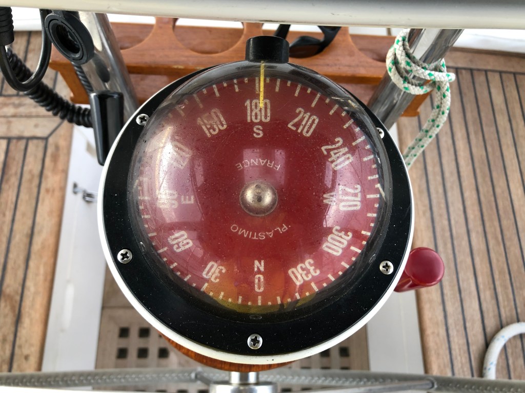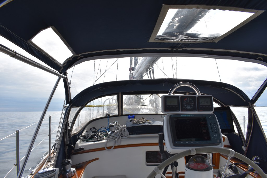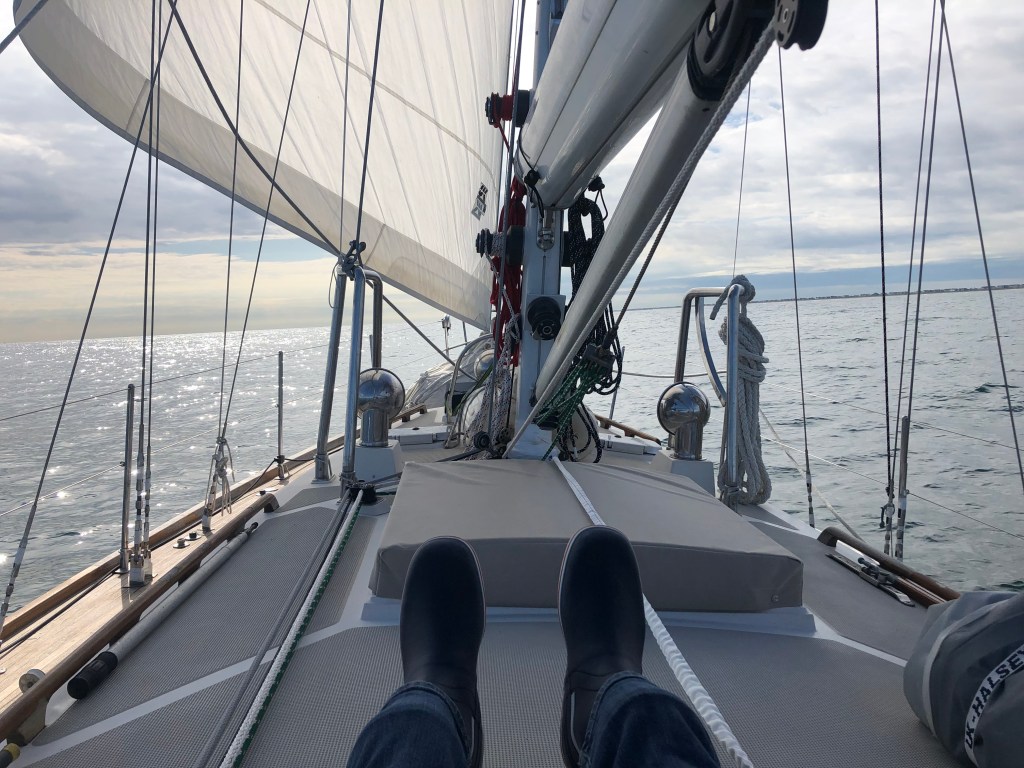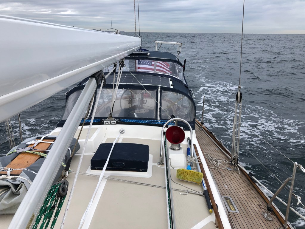 Winds were light and from behind. On a flat sea we probably could have sailed the whole way but with a 2-3 foot quartering swell we were rolling and the sails were not effective on their own. So the engine ran for the first half of the trip to keep us moving at a reasonable pace. The genoa did help stabilize the boat as long as there was enough wind to keep it full. To escape the noise and smell I spent time forward of the cockpit as conditions allowed.