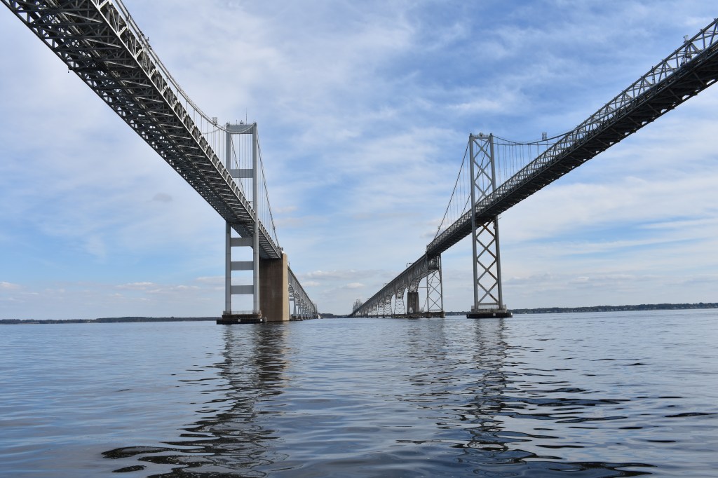 The two spans connecting Maryland’s western and eastern shores just north of Annapolis. The only other bridge across the bay is the Chesapeake Bay Bridge-Tunnel 130 miles to the south in Norfolk/Hampton Roads where the Chesapeake opens to the Atlantic.
