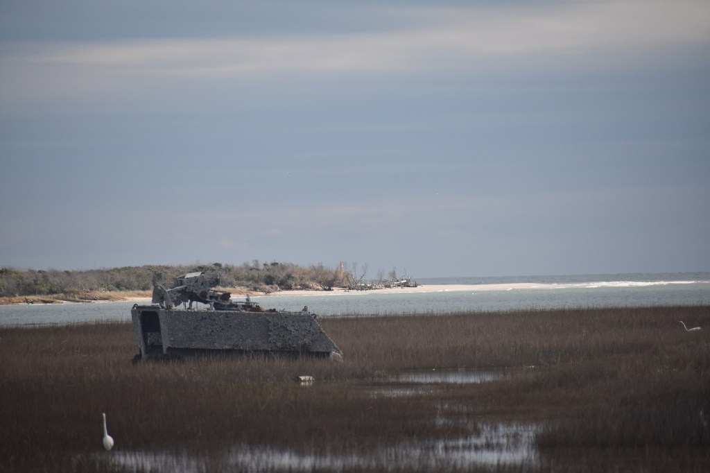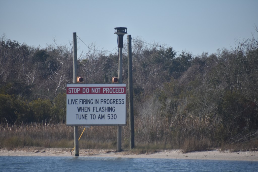We made good time and with the wind behind us were even able to carry a headsail for a while. The last few miles of the day cut through USMC Camp Lejeune. There were some interesting contrasts with beautiful marshes and lots of wildlife in a live-fire training area.