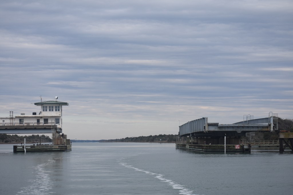 Fortunately the lights were not flashing when we arrived. There were definite sounds of gunfire and occasional louder explosions in the distance.The barrier island separating the ICW from the Atlantic is very narrow here. I could hear the surf breaking as we sailed past. Do you think all those hunters wearing orange know they are dressed like a target? I hope the birds understand what the flashing lights mean.This swing bridge is within Camp Lejeune and is operated by the Marines. They were very punctual.