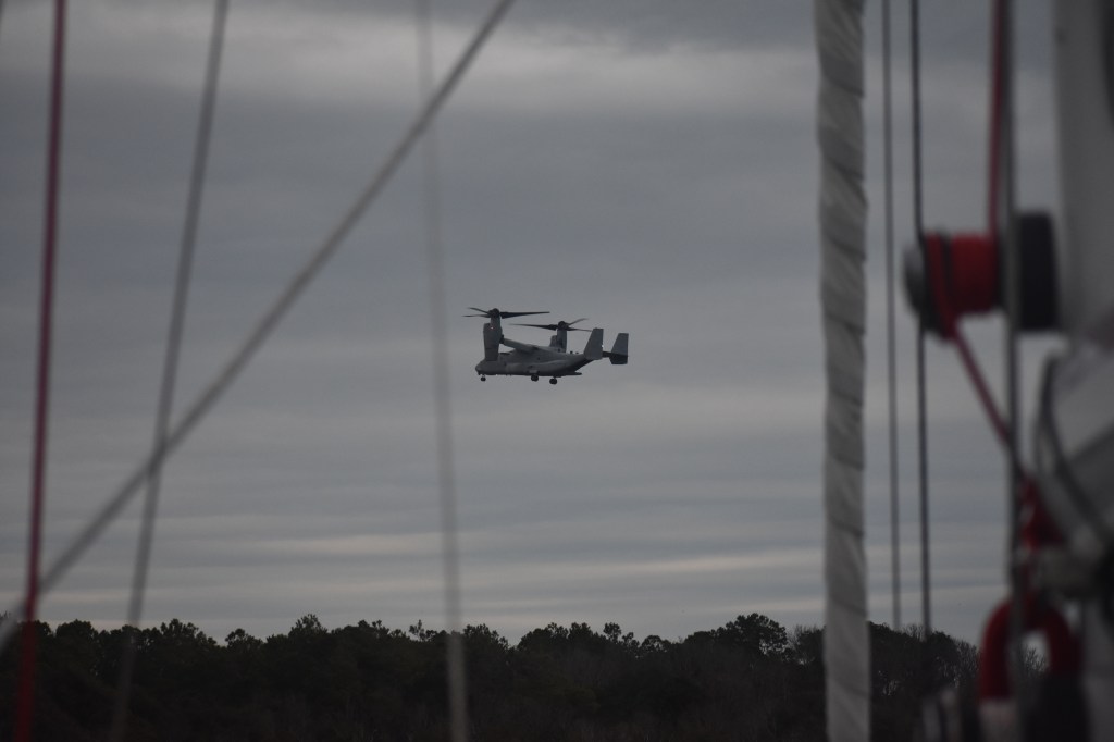 We anchored for the night in Mile Hammock Bay, a well-protected little harbor apparently used by the Marines for launching landing craft. It was a good place to ride out the gale that arrived overnight but was anything but quiet — the little harbor is adjacent to a busy helicopter landing area.