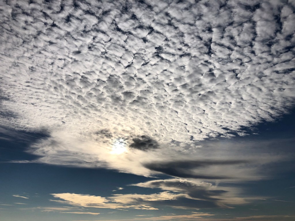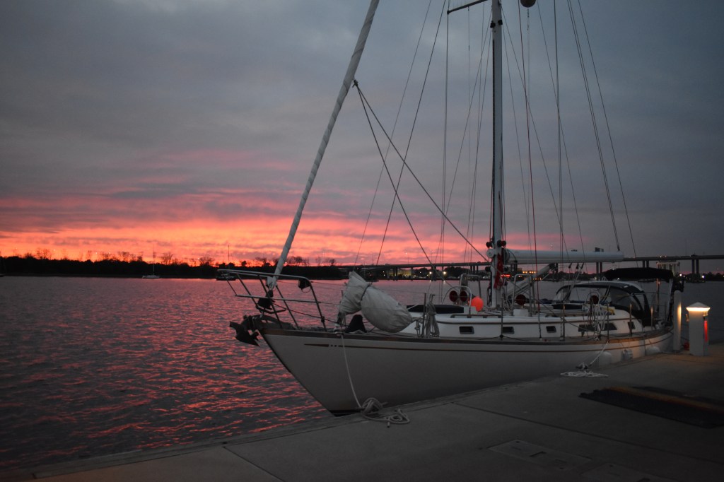 Dockside in Charleston the night before departure.Red sky at night, sailors delight. Or, if you prefer, from Matthew 16:2-3: He answered and said to them, “When it is evening you say, ‘It will be fair weather, for the sky is red’; and in the morning, ‘It will be foul weather today, for the sky is red and threatening.’ Regardless, the sky was extremely red the night before we left Charleston suggesting a pleasant day ahead. We had some traffic on our way out of Charleston harbor. The entrance channel is fairly narrow and with ships and tugs moving in both directions we chose to run just outside the channel between the green buoys and the jetty. I spoke with both the tug and the container ship to let them know our intentions.Finally making some progress under sail. This was just after turning off the engine outside of Charleston with winds 10-15 from the NW. Almost perfect.Sunset at the end of the first day out. Wind has now died to less than 5 kts and shifted to the south — no more sailing for now. Serious chemtrail action around here.Sunrise on glassy seas the next morning. The entire trip crossed an important right whale conservation area and had hoped this would be a good whale watching day. I did see lots of dolphins and birds and a lone sea turtle but no large whales. A little later that morning we saw a nice example of a mackerel sky. These high puffy clouds (cirrocumulus) look like fish scales and indicate that a change is coming. “Mackerel sky, not twenty-four hours dry” is the saying. (Source unknown, but not Jesus). Another correct prediction – by late evening we were being walloped with strong wind and heavy rain. Fort Clinch on Amelia Island at the mouth of the St. Mary’s River. Lots of beachgoers and kayakers on a warm Saturday morning. The opposite side of the river is Cumberland Island, Georgia. I’m pretty sure we strayed across the centerline so we’ve now passed through all 12 states between Massachusetts and Florida.Heading south on the Amelia River. I’m guessing this is a pulp mill but can’t get past how the big pile reminds me of the mashed potato mountain in Close Encounters. Also tough to get past the smell. Fortunately we’re upwind today.The view from our mooring in Fernandina Beach before the wind started blowing. The view in the other direction. Given today’s winds I don’t expect to put Dinghy in the water and explore the town. Instead I’m using the time to catch up on some cleaning and maintenance. And baking some bread — because I actually need bread and not just as an excuse to heat the cabin.
