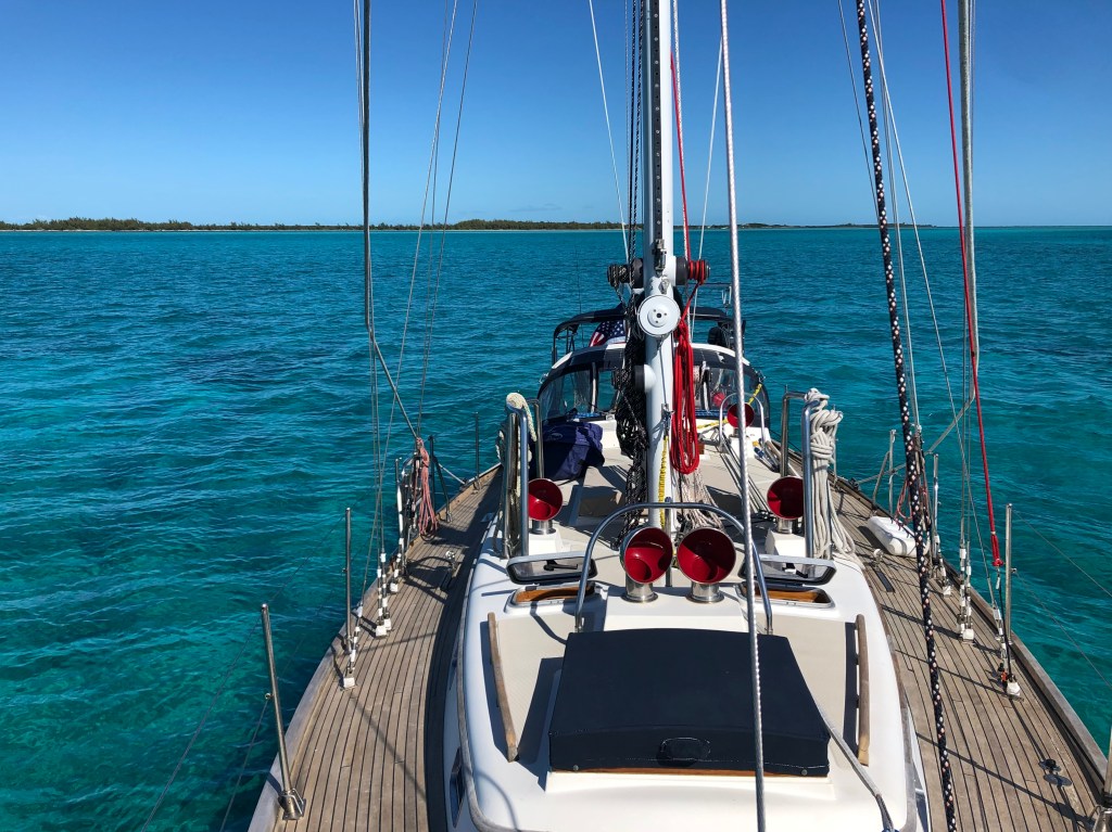 We left Bimini yesterday around noon with the high slack tide. The wind and seas were just perfect for a sail north around the island and onto the shallow bank. The water was so clear I could clearly see individual starfish on the seabed and the shadow of Andante’s mast on the sandy bottom. Around sunset the wind died completely and many of the hours of darkness were spent drifting under a crystal clear sky and coordinating passing maneuvers with freighters and mailboats. Altogether very pleasant.