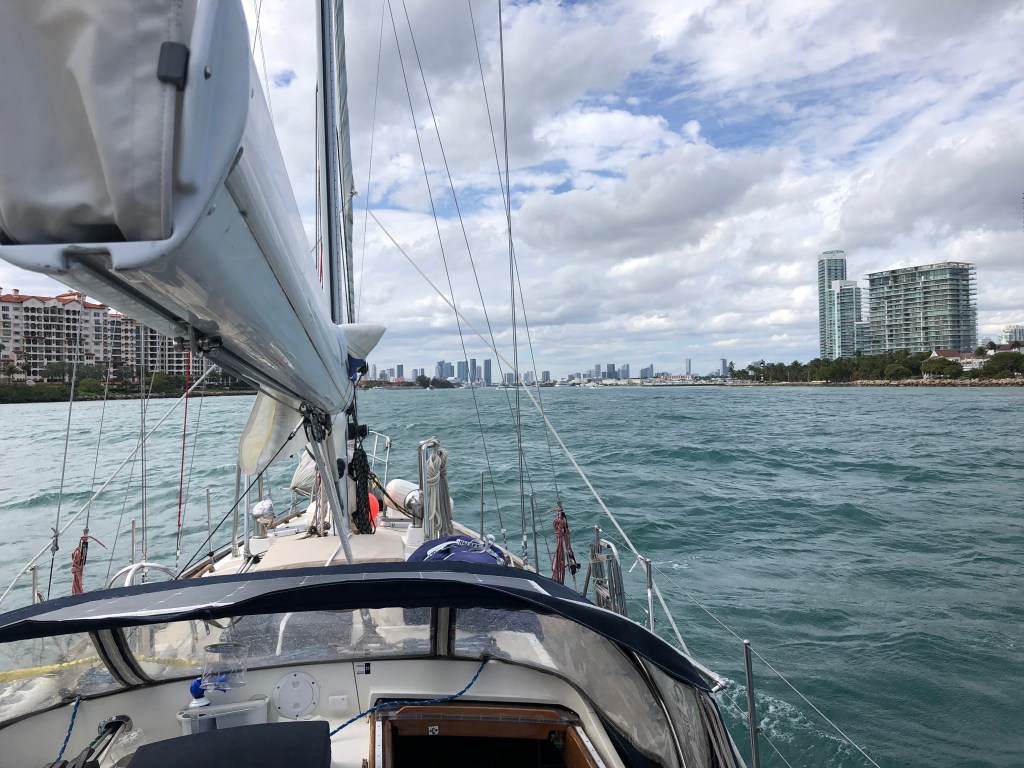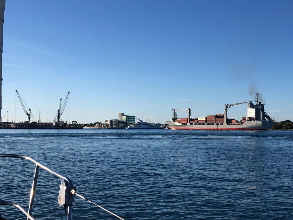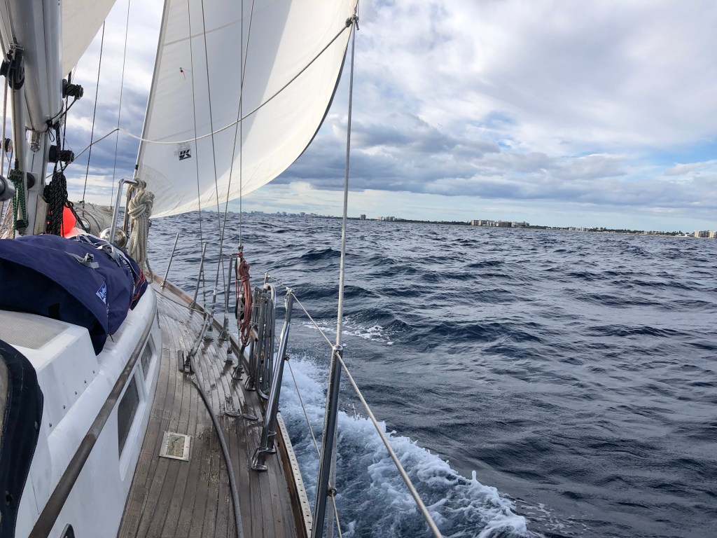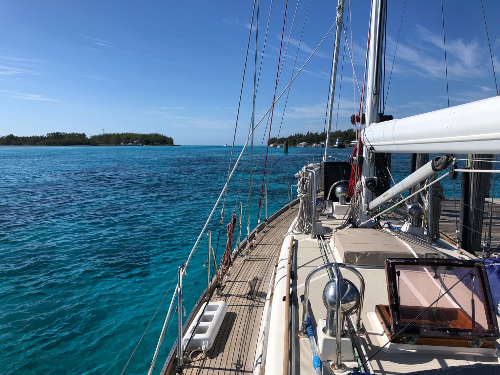 We left Bimini yesterday around noon with the high slack tide. The wind and seas were just perfect for a sail north around the island and onto the shallow bank. The water was so clear I could clearly see individual starfish on the seabed and the shadow of Andante’s mast on the sandy bottom. Around sunset the wind died completely and many of the hours of darkness were spent drifting under a crystal clear sky and coordinating passing maneuvers with freighters and mailboats. Altogether very pleasant.